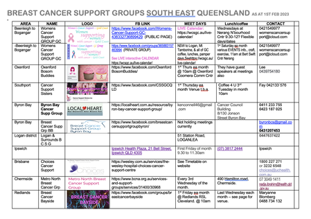I will post below the list I have just drafted of local support groups for women with cancer on the Gold Coast and Brisbane and would be rapt if you know of any others if you can please advise me - the more the merrier.