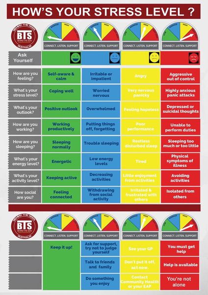 This is a very interesting way of working out your stress levels. Down the bottom is the 'Act if necessary' recommendations, depending on which level you may be at. There is help out there xx ...