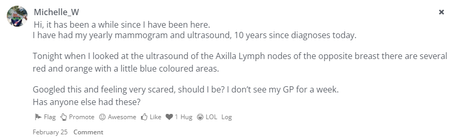 Does Scanxiety ever really disappear? I think not. It is 4 years in Nov since my ILC tumours were found, by accident, by my GP - as the rural BreastScreen Bus screens totally missed it ..... TWICE. Rural breastscreen buses do not have 3D mammograms - only 2D ones - and they are unlikely to pick up Invasive Lobular Cancer (that does not present as a 'lump' ....) and any cancer is almost impossible to 'see' in those with Dense Breast Tissue. If you don't know what breast tissue type you have, get your Surgeon/Oncologist to tell you - as Breast Screen NSW refuses to do so. If you are able to pull up a pic of your Mammograms .... you'll actually SEE if you have dense breast tissue, as much of the breast will showing as 'white' (rather than fairly clear) and as cancer also shows up as 'white' ..... the dense breast tissue hides the cancer. What followed was 2 years of anxiety as I had a recall on my first anniversary scans, which luckily, were benign .... but being rural, things all take longer to happen. Altho I had my surgery within days of seeing the surgeon (10 days after my diagnosis on Jan 5th was confirmed) it had taken 2 months to get to the diagnosis, with my biopsy being done between Xmas & New Year. The following year, the biopsy was on Xmas Eve .... so 2 x Christmases/New Years - totally stuffed!! For this reason, I brought my scan dates a month early to October - so that if anything needed doing (ie biopsy) I wouldn't be in the Xmas Rush! SO .... I head north today for my annual Mammogram and Ultrasound (luckily, having the resident specialist breast Cancer Radiographer doing both!) I'll take hubby with me & will probably even take him into the clinic room with me (if allowed) to keep an eye on him as he has mod-severe dementia. Otherwise, I'd need to arrange someone to sit with him, if I left him at home. Up til this morning, I hadn't really 'thought' of the scanxiety .... but then it raised it's ugly head again! grrrr. I am not expecting any adverse results - but with this beast, you just never know! I see my Rad Onc next week, also up north - my 2nd last visit to her - next year being Year 5 since detection. Wish me luck!!1.1KViews0likes44Commentswhat next