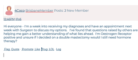 I'm a 54 year old women of 3 gorgeous grown up sons living with my partner of 5 years & loving life after a few years of turbulence both personally & professionally. I am newly diagnosed with invasive NST, + for both ER & PgR apparently that's good, yesterday was a week after right boobie lumpectomy & 3 x axillary lymph nodes removed and results show its travelled to the lymph nodes so pet scan booked for next Tuesday. Its been a roller-coaster, which I know many of us have experienced and my positivity since surgery is now replaced with a sick to the core feeling of dread. Which is unusual for me as a normally face everything head on but this has got me. Radiotherapy has been mentioned and then yesterday chemo was mentioned for the first time as a most likely scenario not all results were back & the rest awaits me next Tuesday. My head space at the moment is like a magpie flitting from shiny wtf-ness to omg-ness!! The cherry on the top is I'm 2 months into a new career and on LWOP from a 34 year career wondering what my new employer who has been very supportive will wonder & yes I am over thinking it :)413Views0likes11CommentsI’m so lost